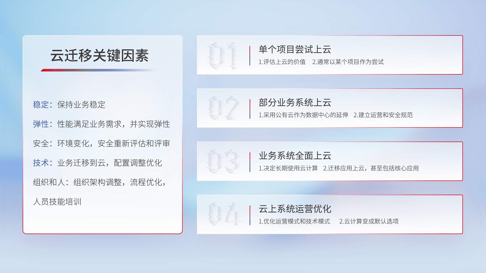 结合实际业务,,,,从规划设计、、、、云平台选型、、、、云原生改造、、数据迁移、、、、集成交付,,,迁移全过程为客户识别最佳上云路径,,,,做好风险识别管理,,设计网络架构、、、、身份权限、、安全审计合规、、、操作审计、、、日志审计、、、、监控告警策略、、多站点容灾设计等,,,,对云上基础设施进行整体规划,,提升IT治理水平,,,,以满足弹性、、高可用、、高性能的需求。。。。